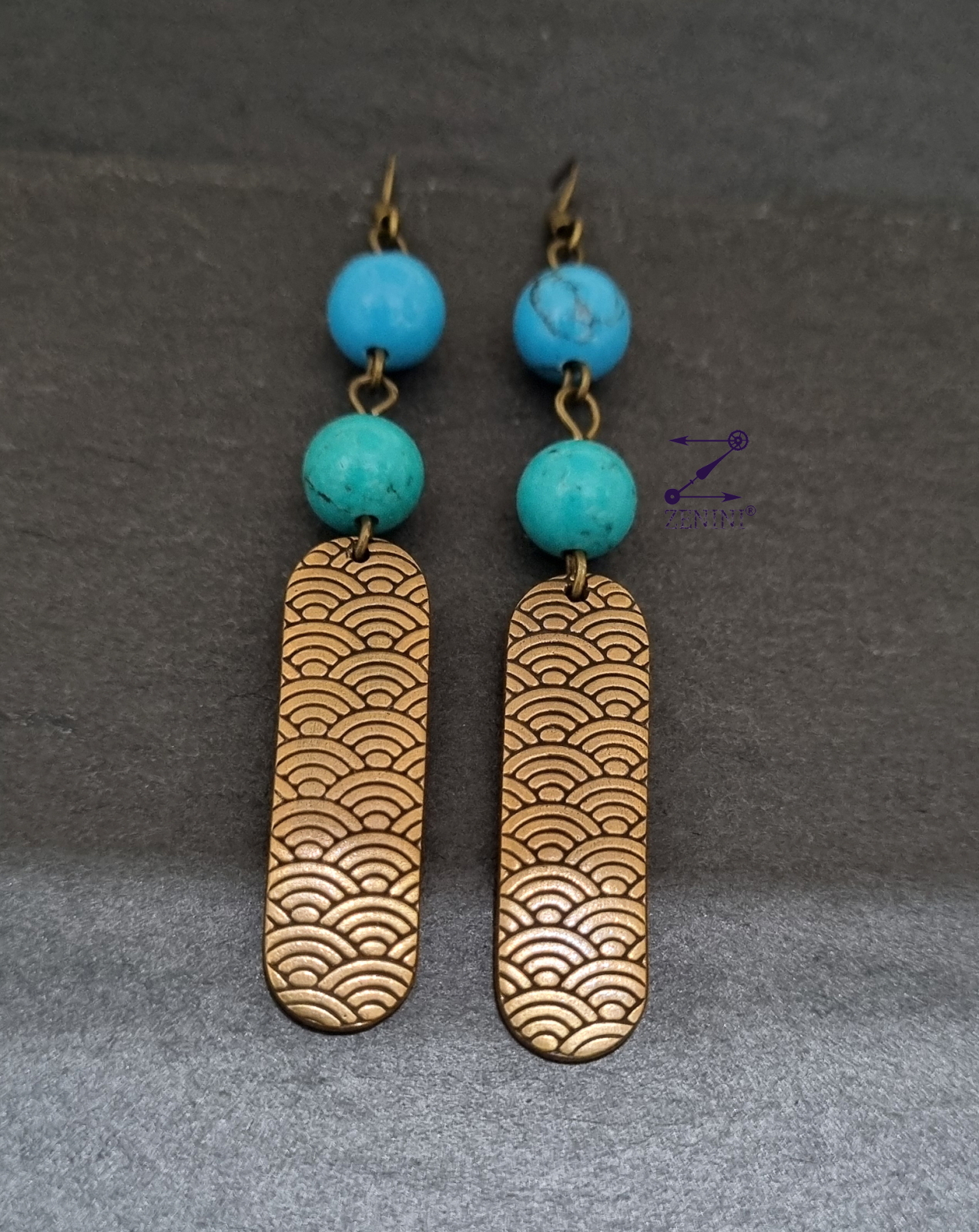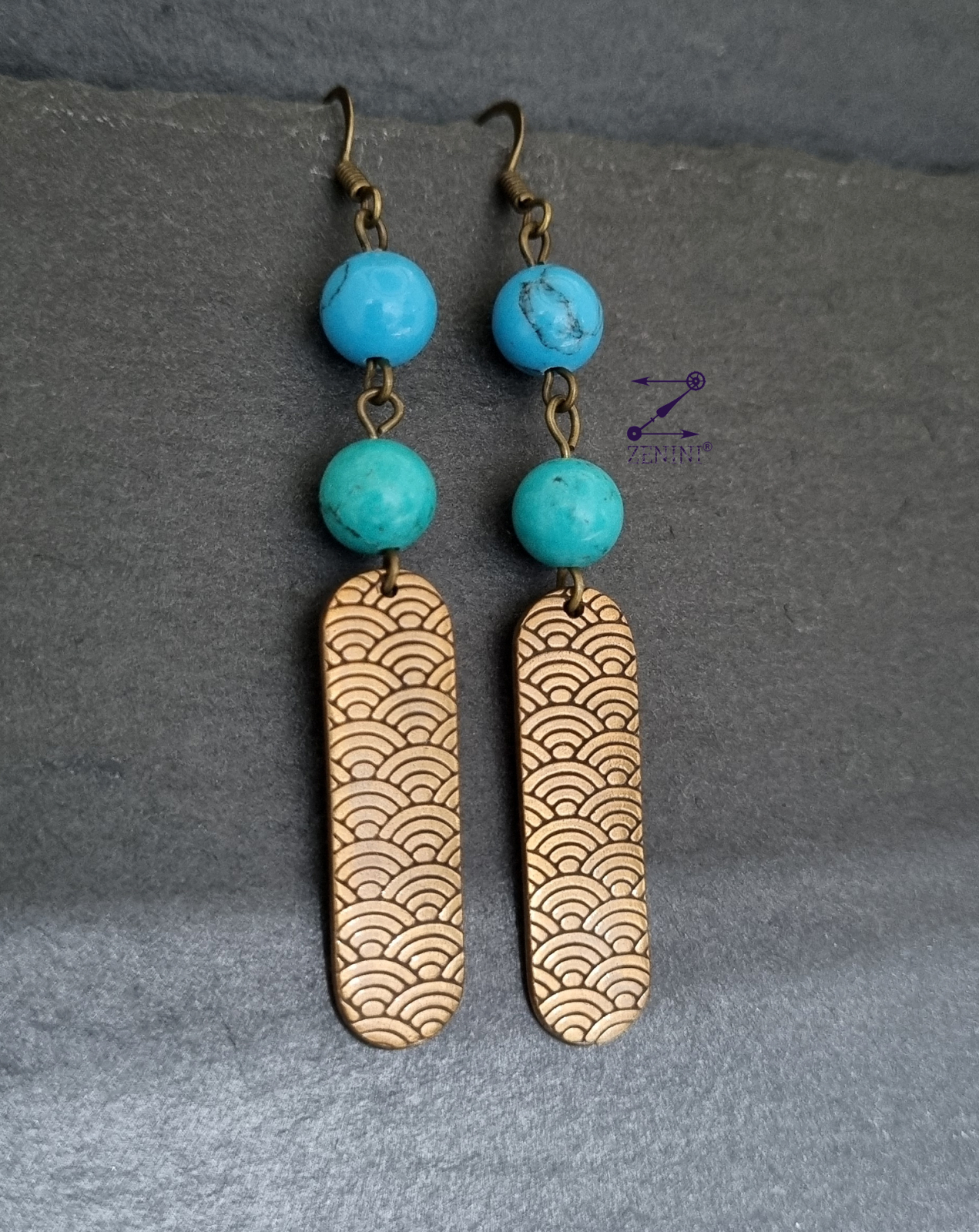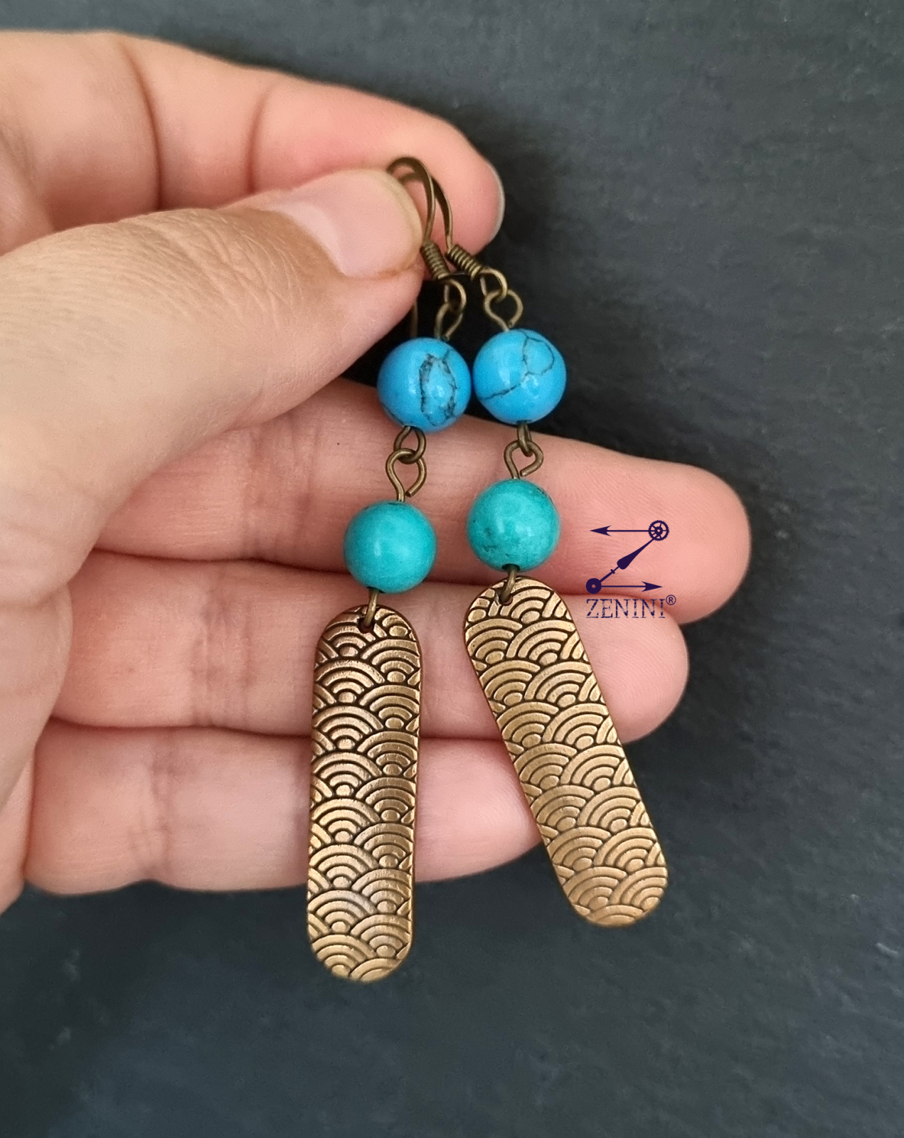 Cercei din bronz ovali cu model cu valuri, accesorizati cu margele turcoaz.