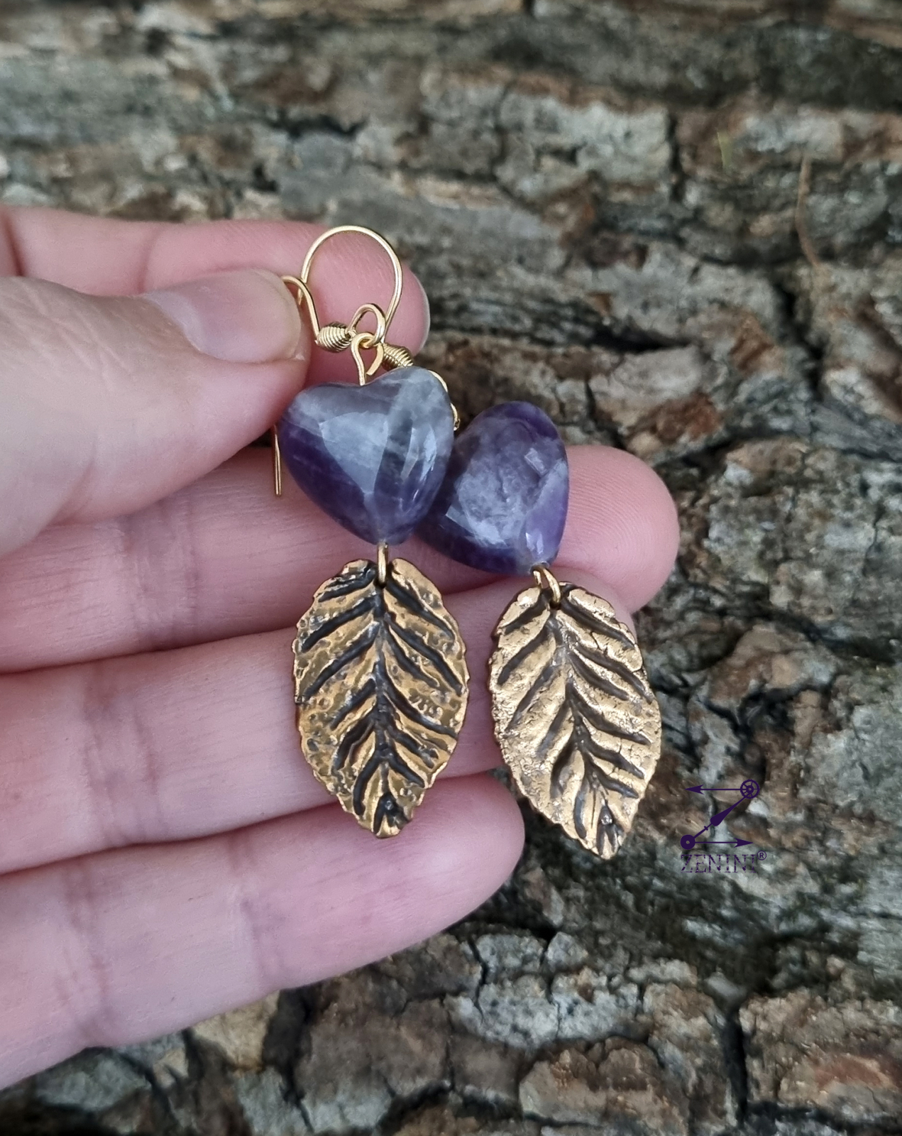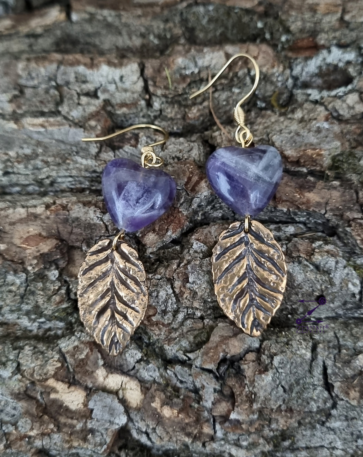 Cercei din bronz cu model cu frunze, accesorizati cu margele de ametist in forma de inima.