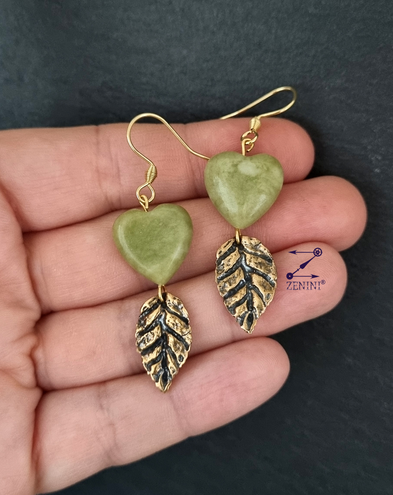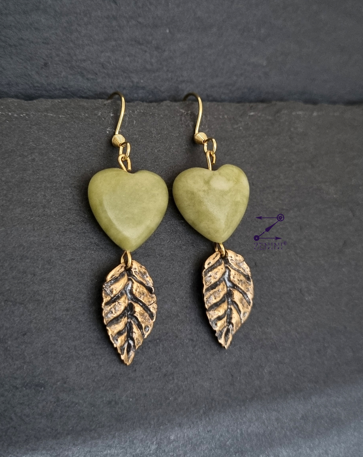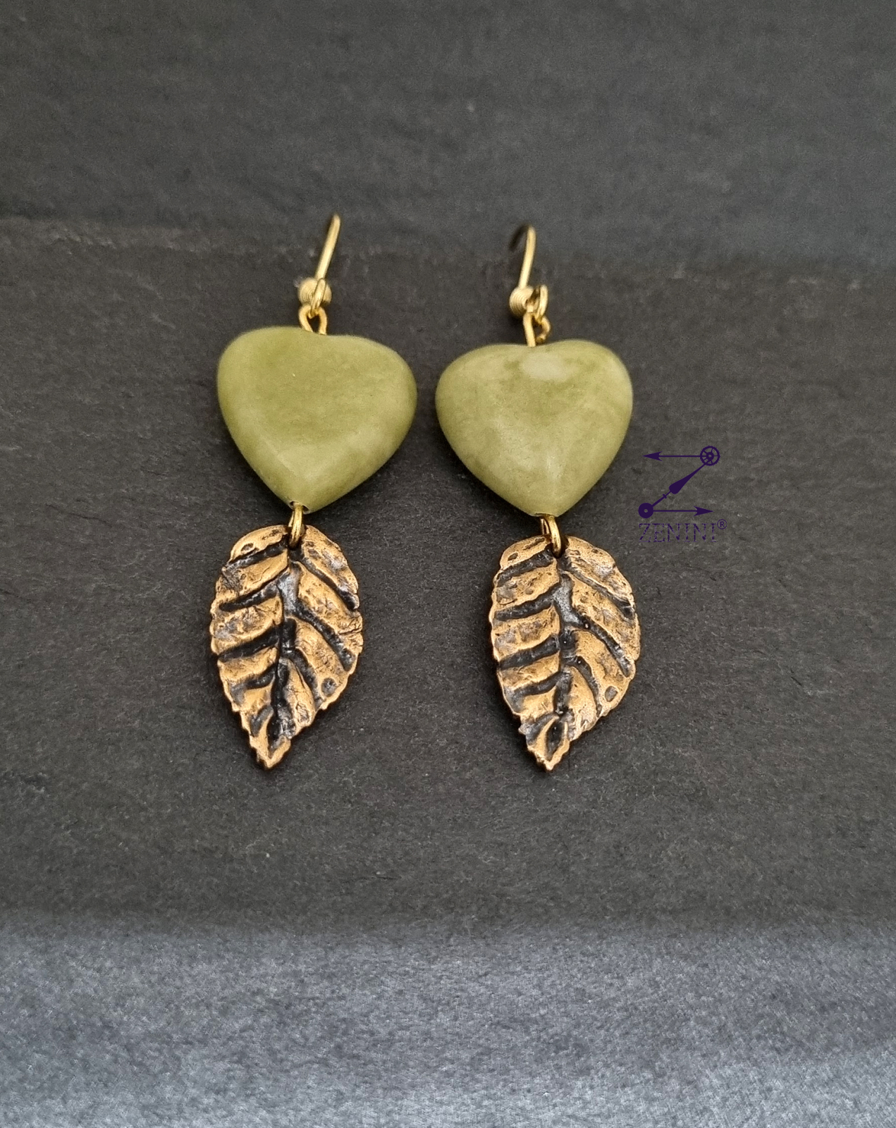 Cercei din bronz cu model cu frunze, accesorizati cu margele de jad in forma de inima.