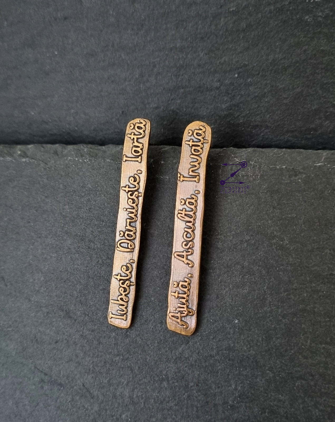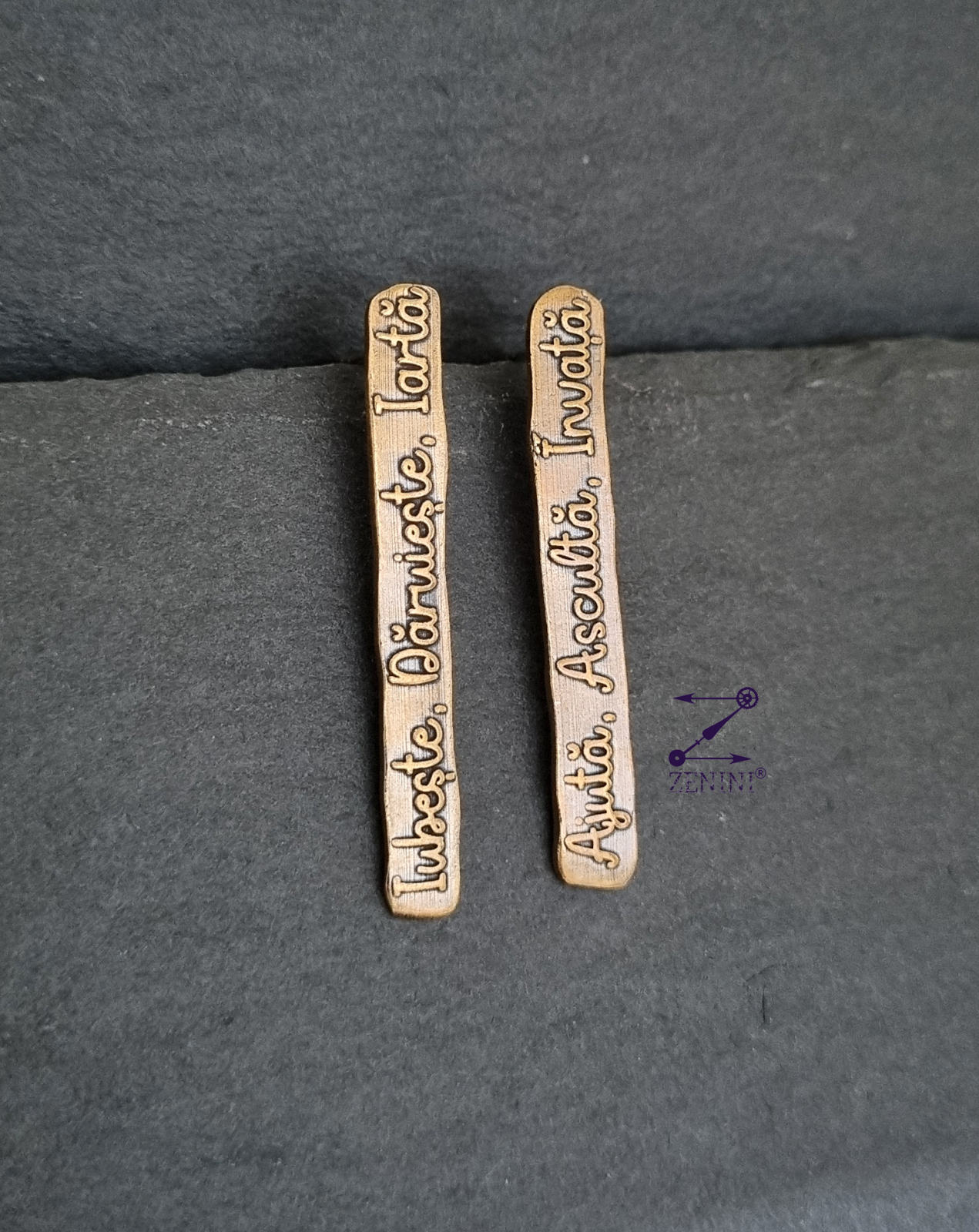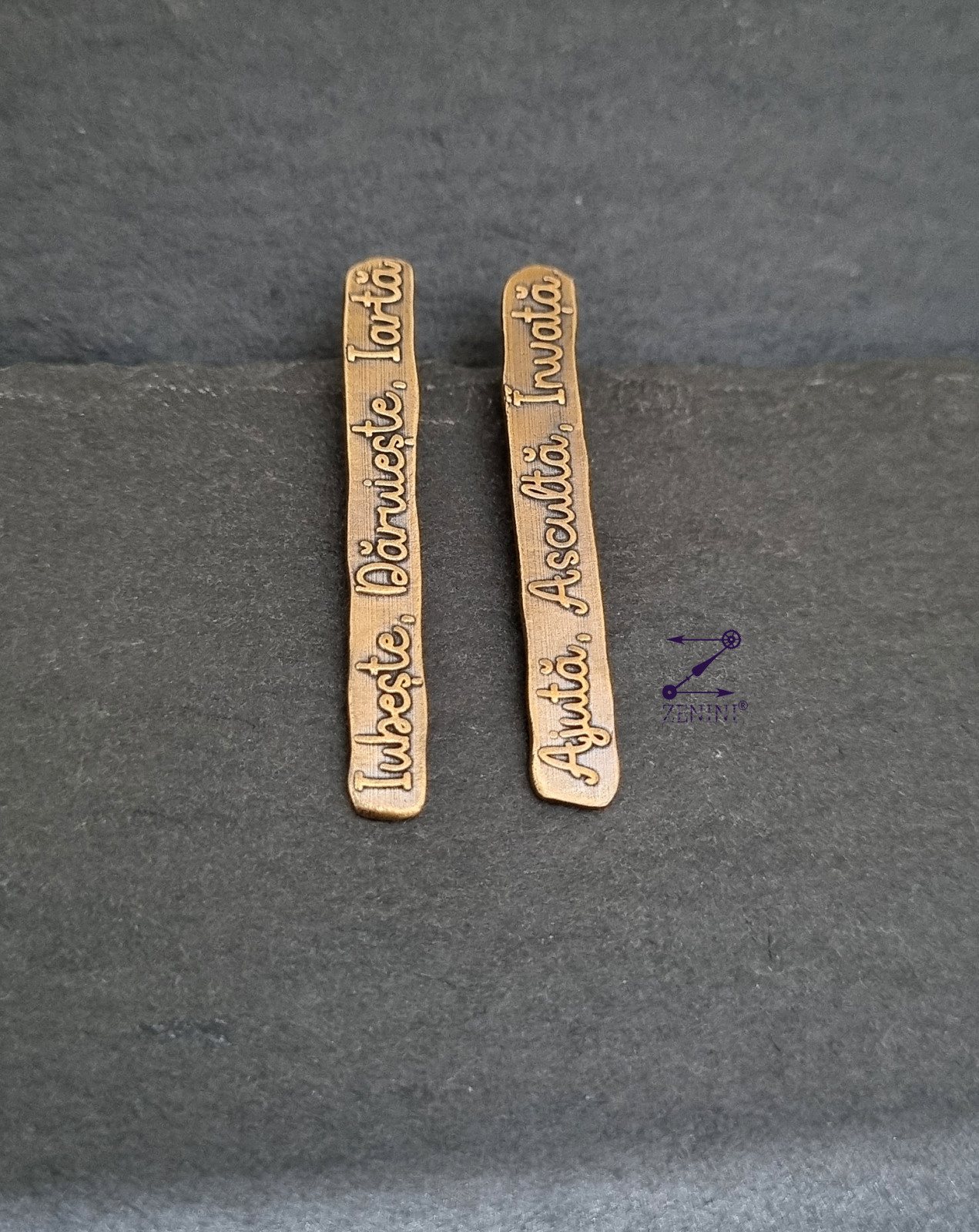 Cercei din bronz cu diferite cuvinte motivationale (Iubeste, Daruieste, Iarta si Ajuta, Asculta, Invata), realizati manual.