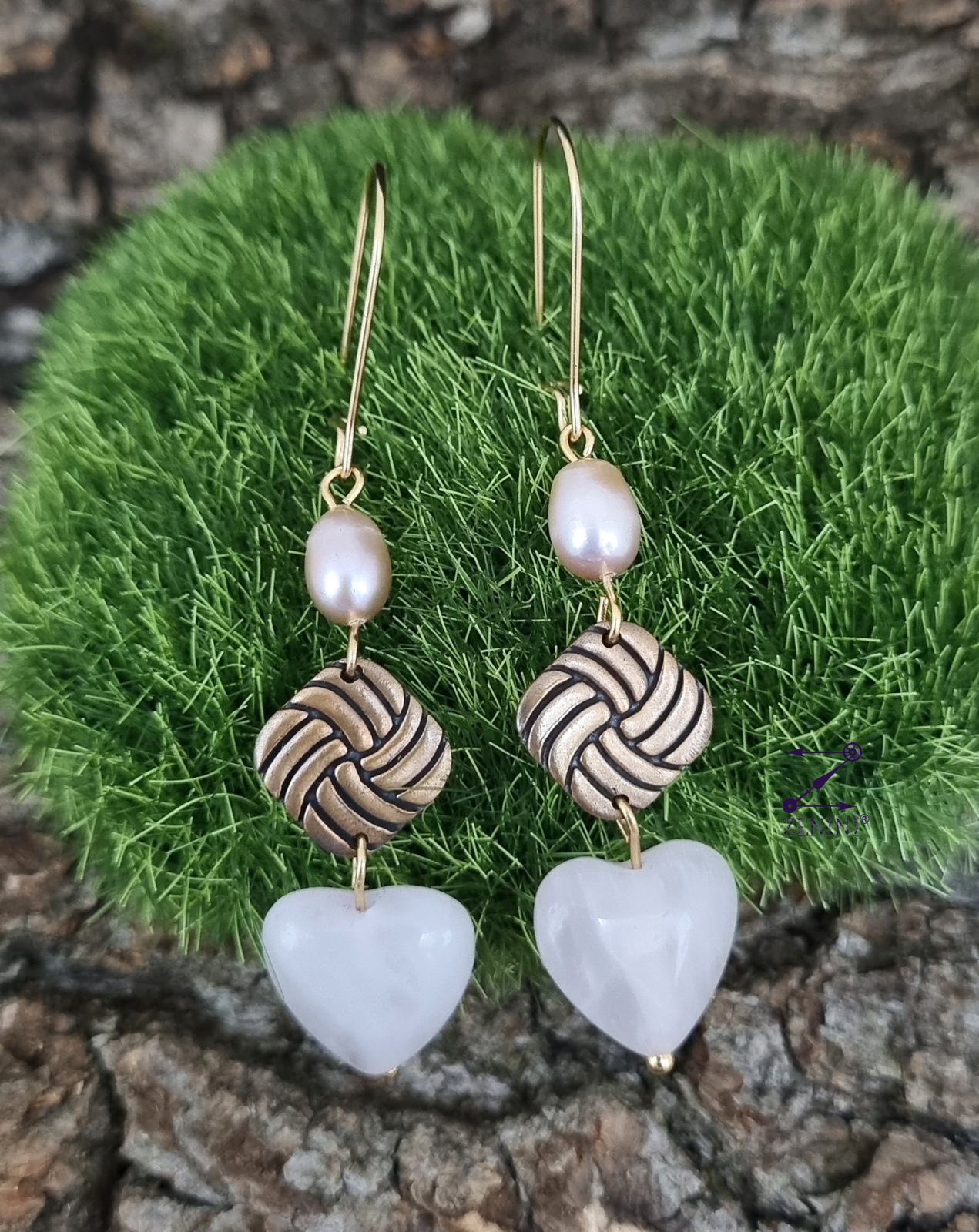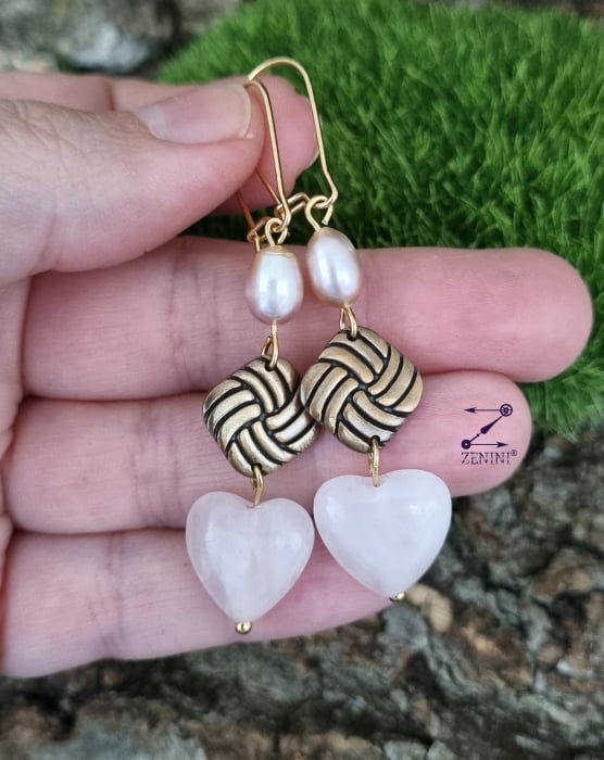 Cercei din bronz cu perle de cultura roz si inimi de cuart roz.
