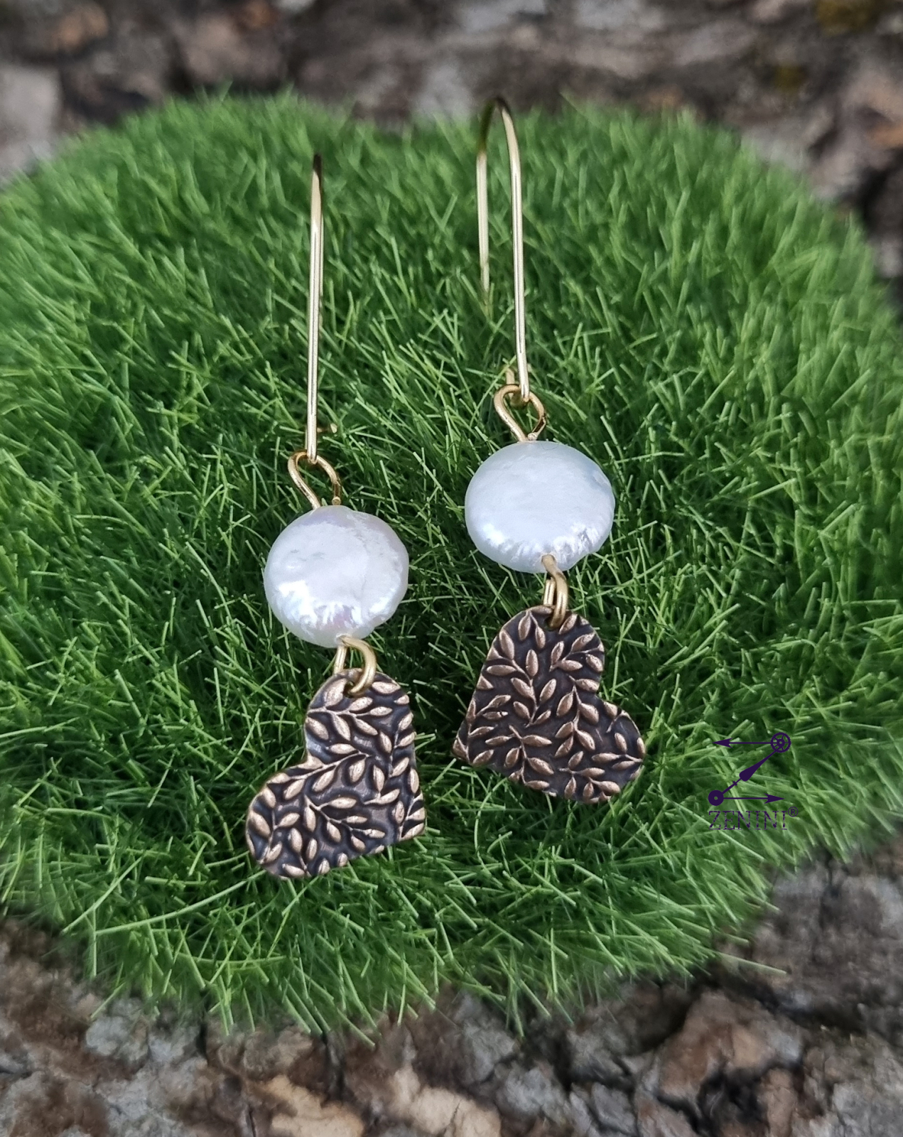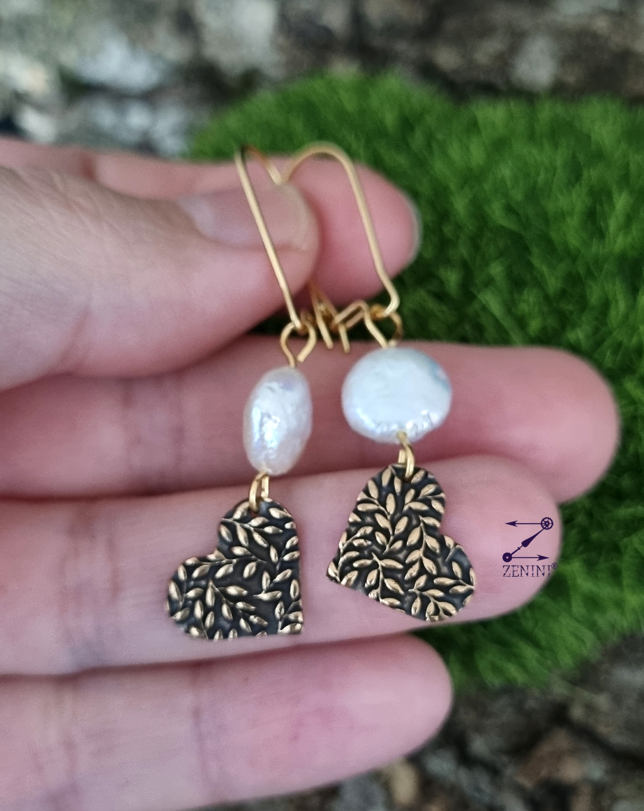 Cercei inimioare din bronz cu motiv cu frunze, accesorizati cu perle baroc.