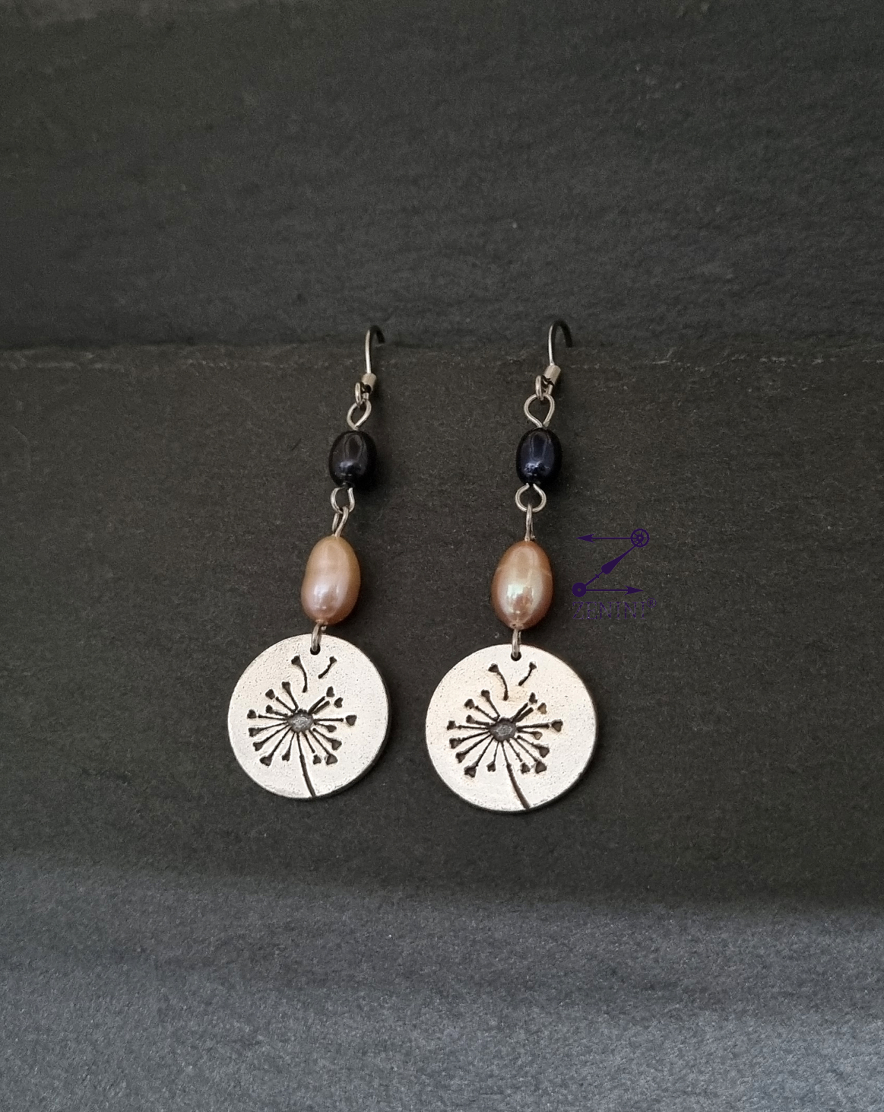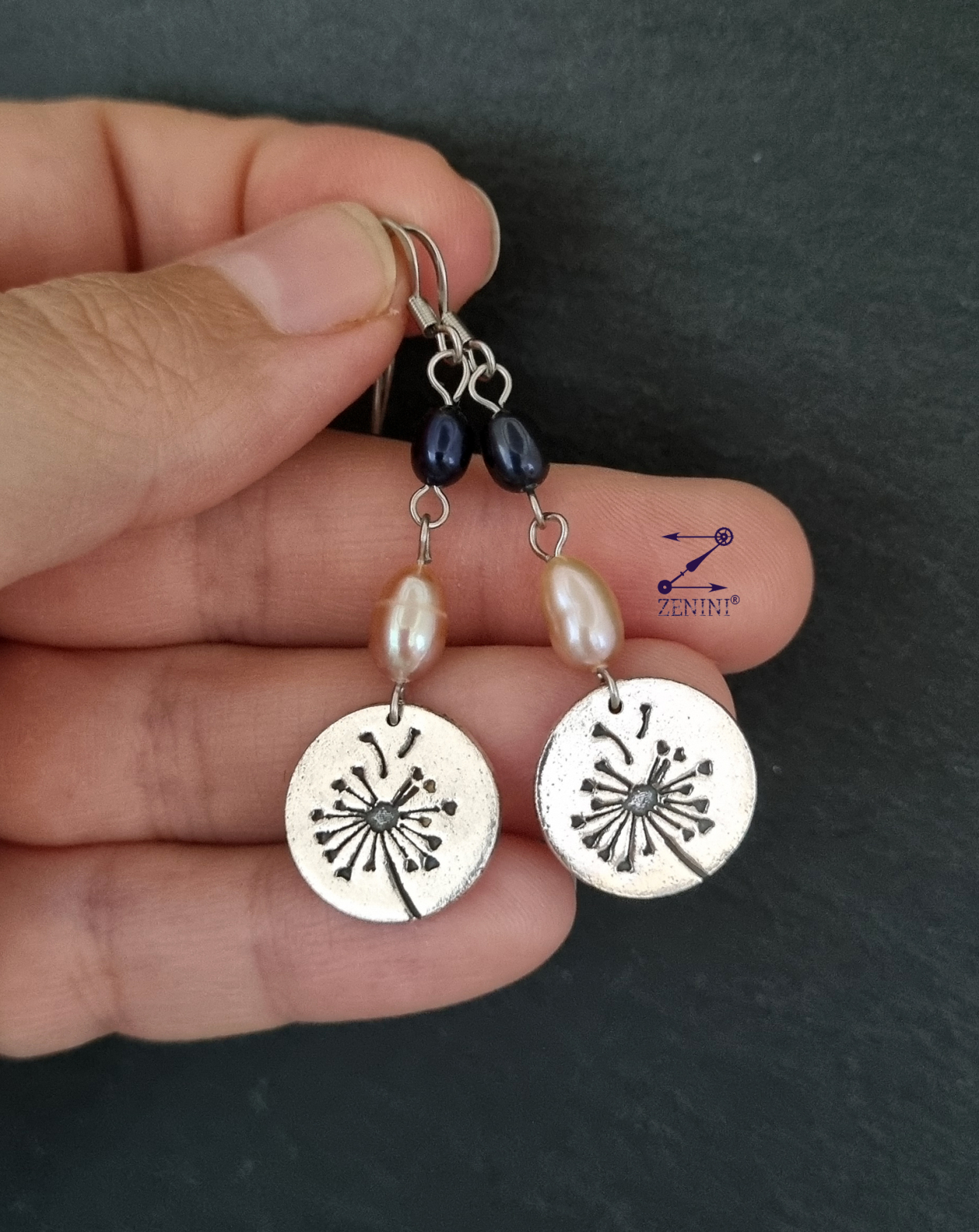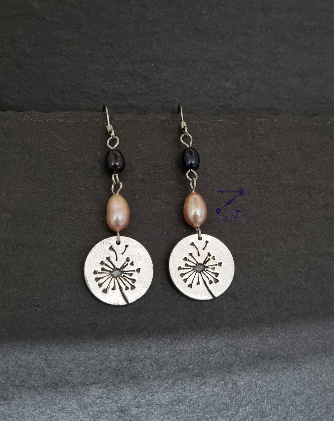 Cercei din argint cu model cu puf de papadie, accesorizati cu perle de cultura.