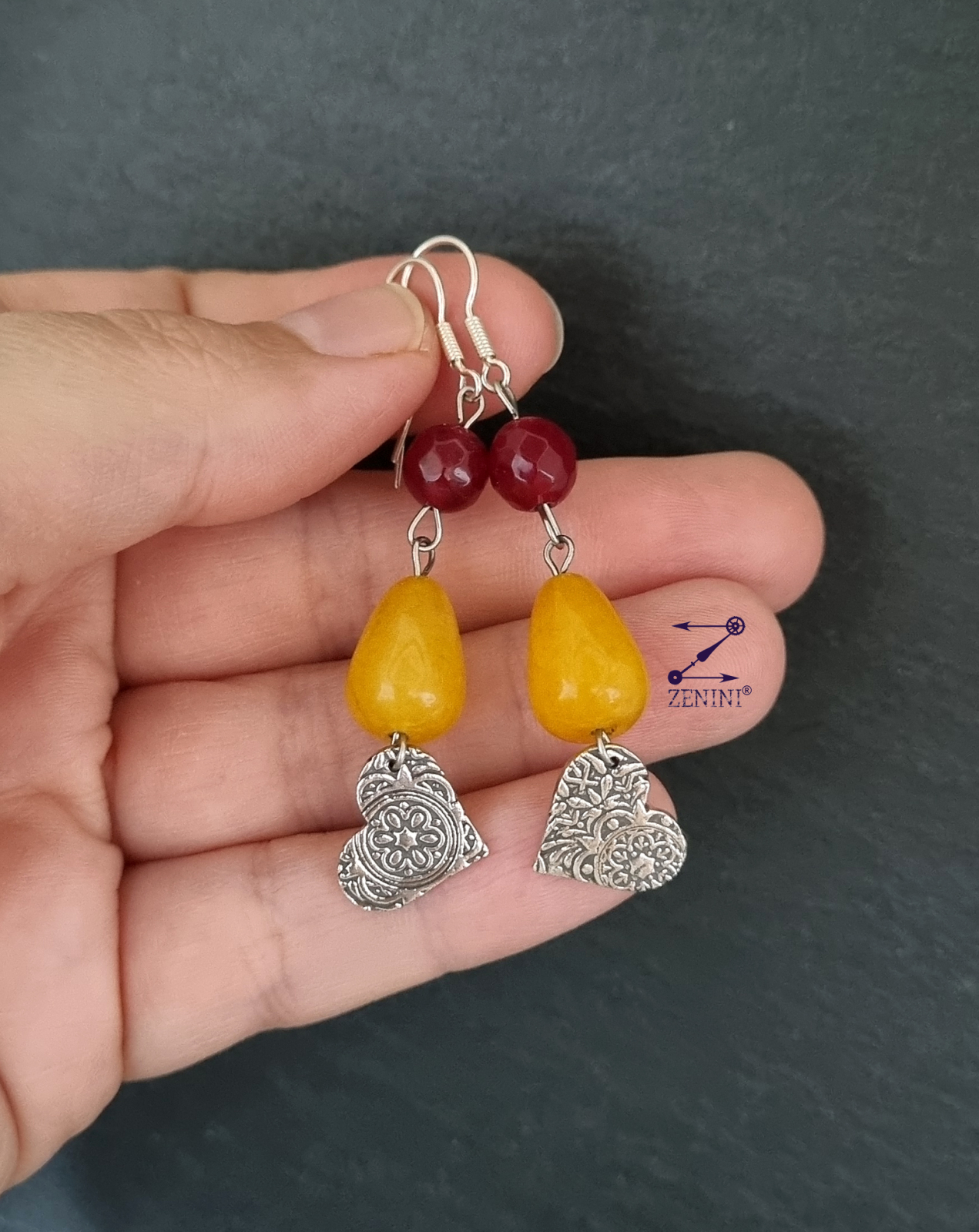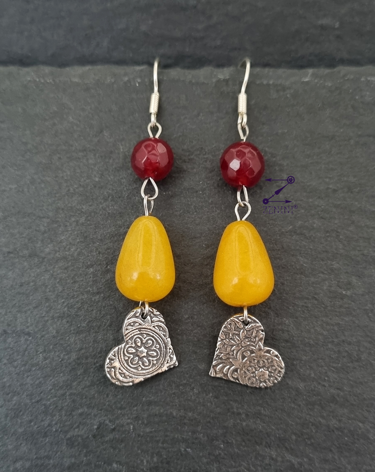 Cercei din argint cu inimioare cu model oriental, accesorizati cu margele de jad.