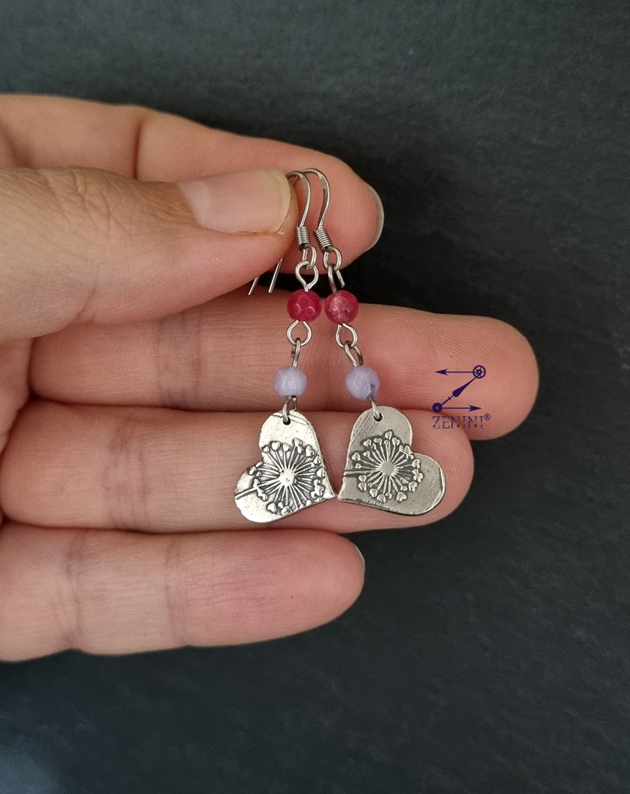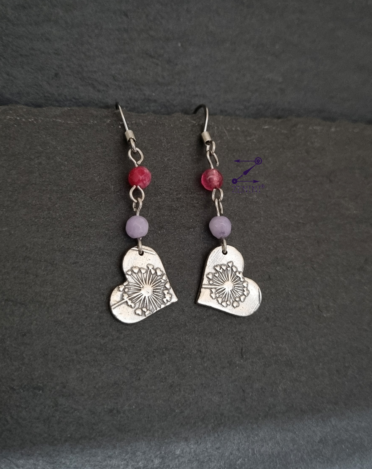 Cercei din argint in forma de inima cu model cu papadie si margele de jad, realizati manual.