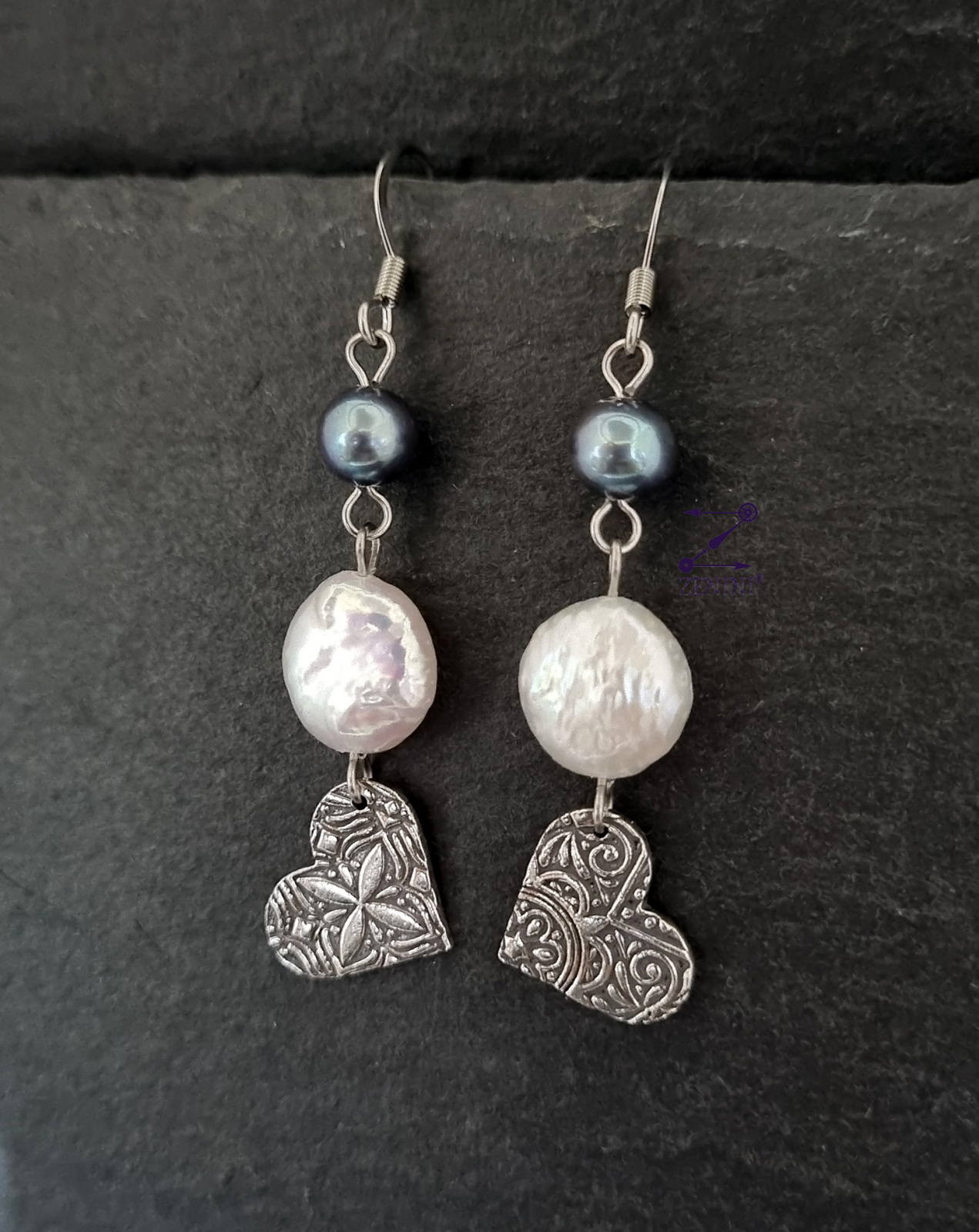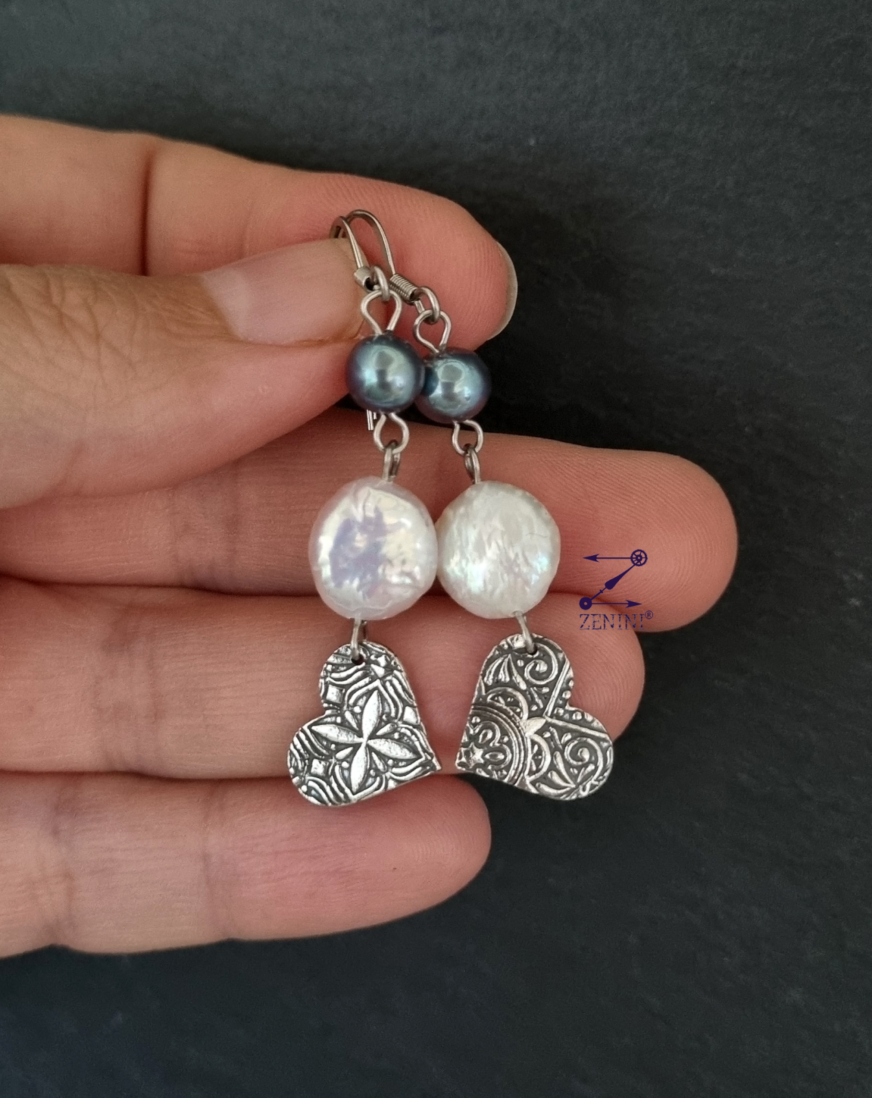 Cercei cu perle baroc, perle de cultura si inimioare de argint cu model oriental, realizati manual. Argintul a fost antichizat, pentru a scoate in evidenta modelul si textura metalului.