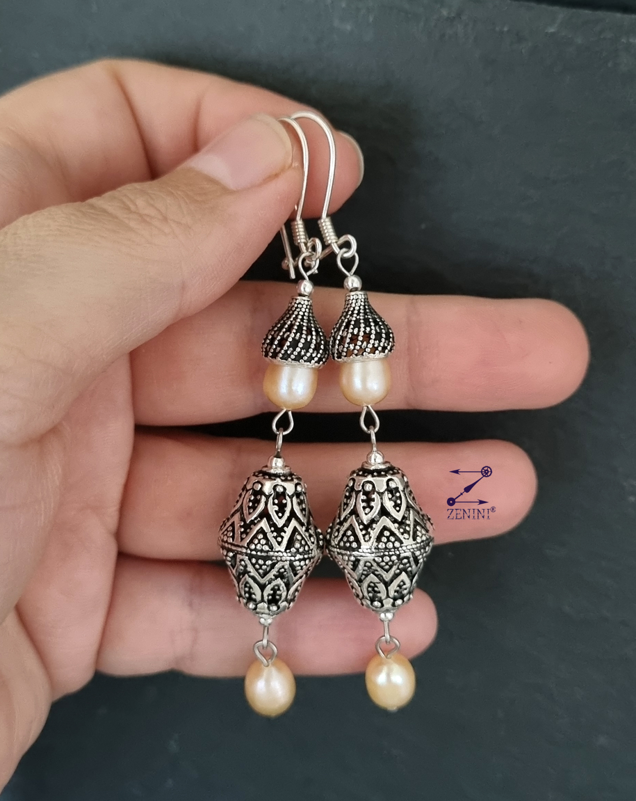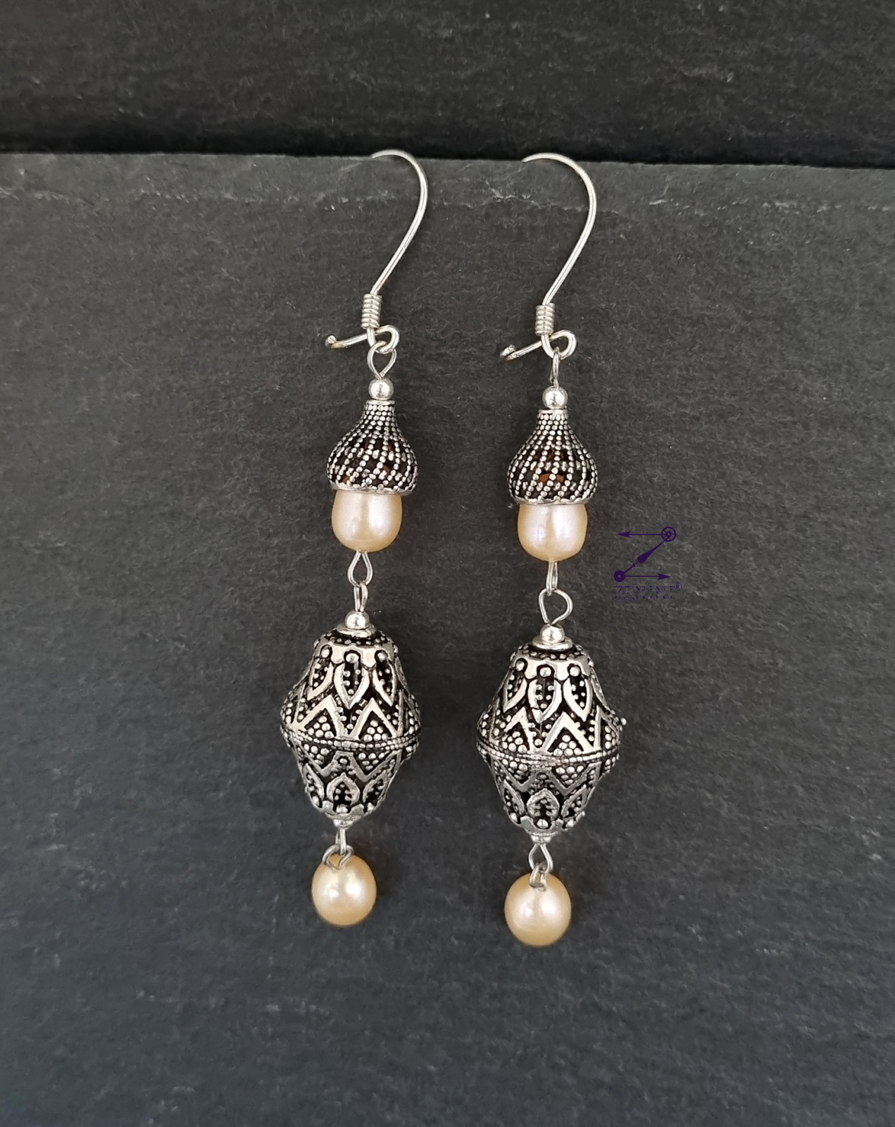 Cercei lungi din argint cu margele cu model oriental si perle de cultura culoarea piersicii.
