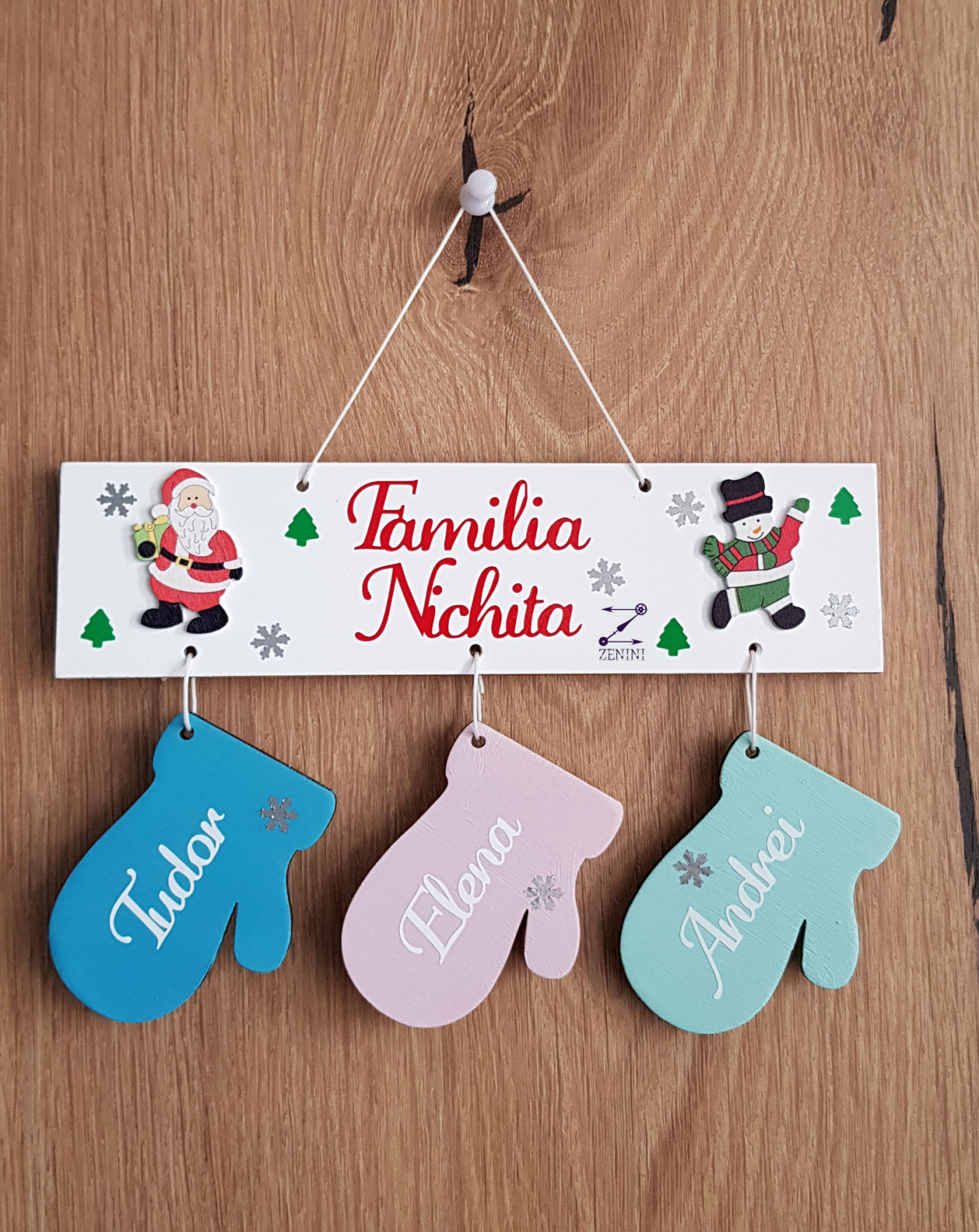 Ornamentul este alcatuit dintr-o placuta din lemn pe care va fi scris numele familiei si din manusi pictate si personalizate cu numele fiecarui membru.