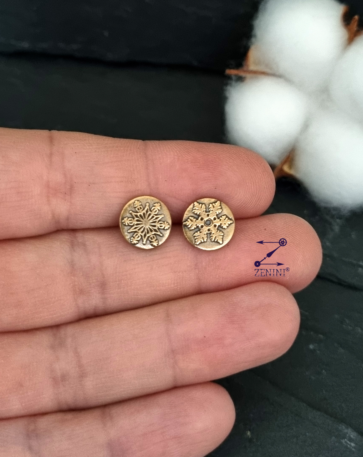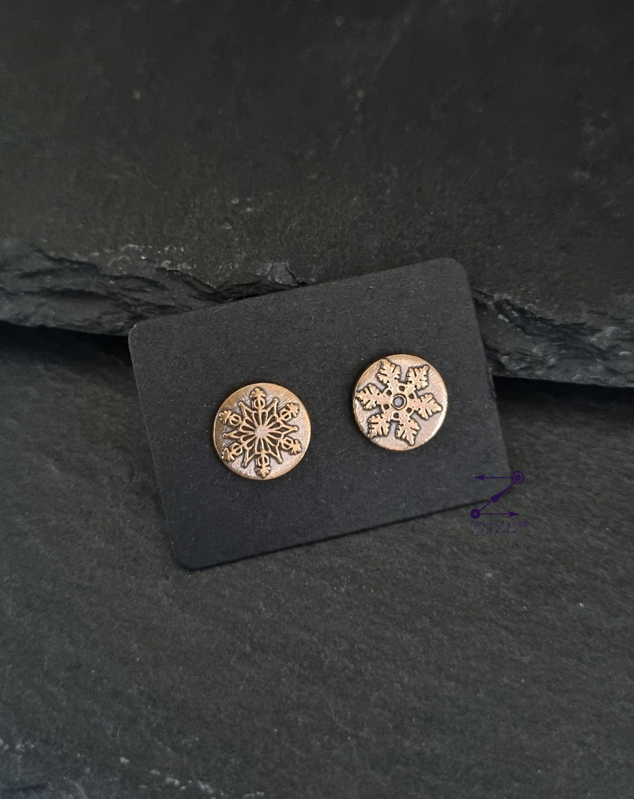 Cercei din bronz cu model cu fulgi de zapada, realizati manual si antichizati. Fiecare cercel are un alt model de fulg de nea.