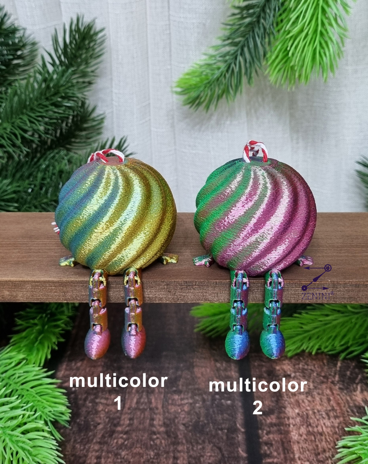 Glob pentru brad cu picioare, imprimat 3D. Globul poate fi pus in brad sau pe un raft, picioarele ii atarna intr-un mod amuzant.